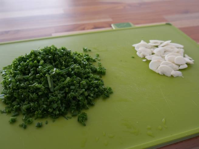 Cortar el pollo en cubos. Cortar en rodajitas los puerros, el ajo en láminas, y picar bien fino el ciboulette.